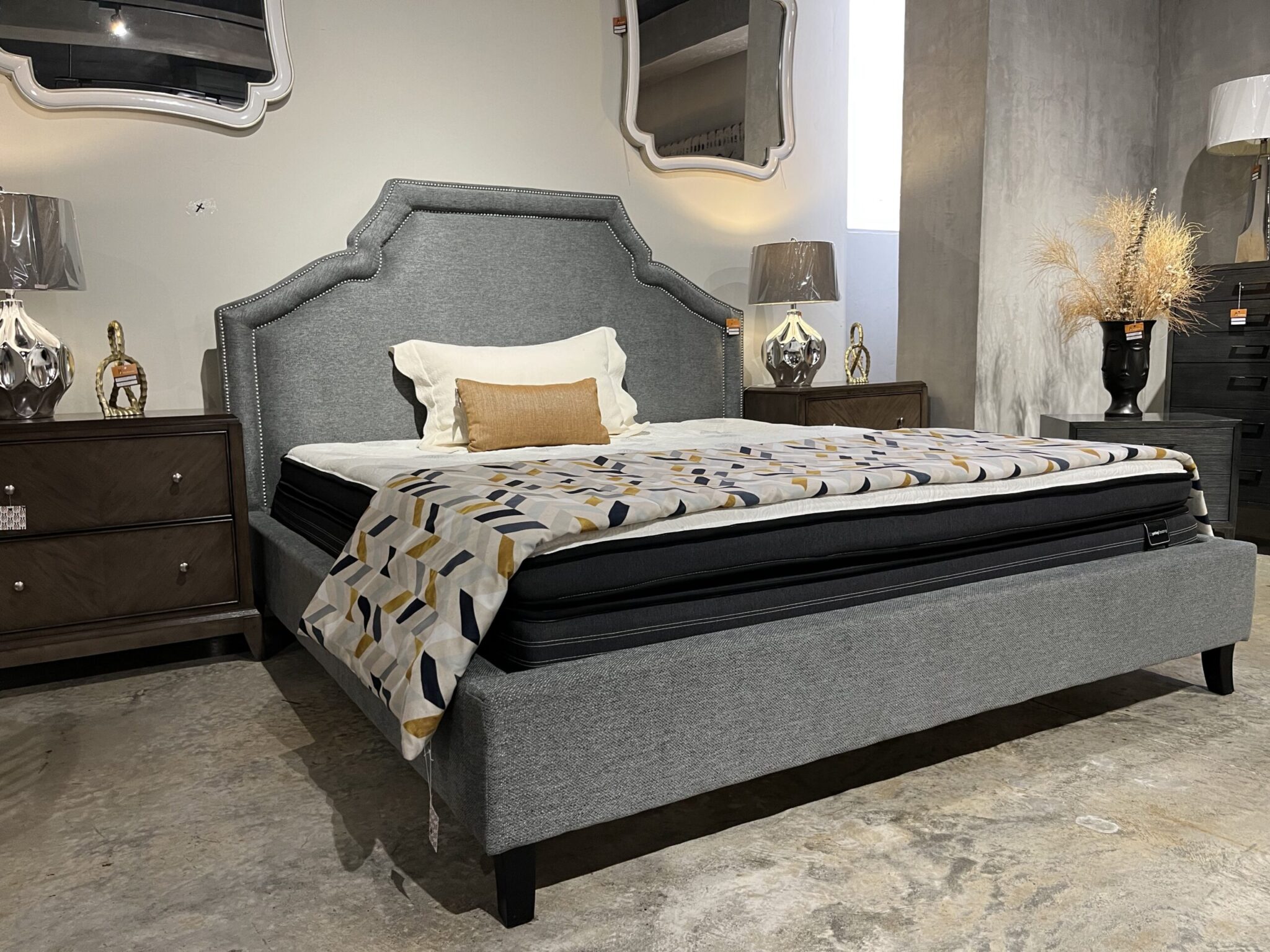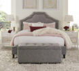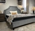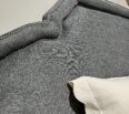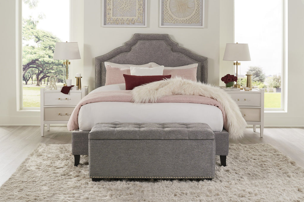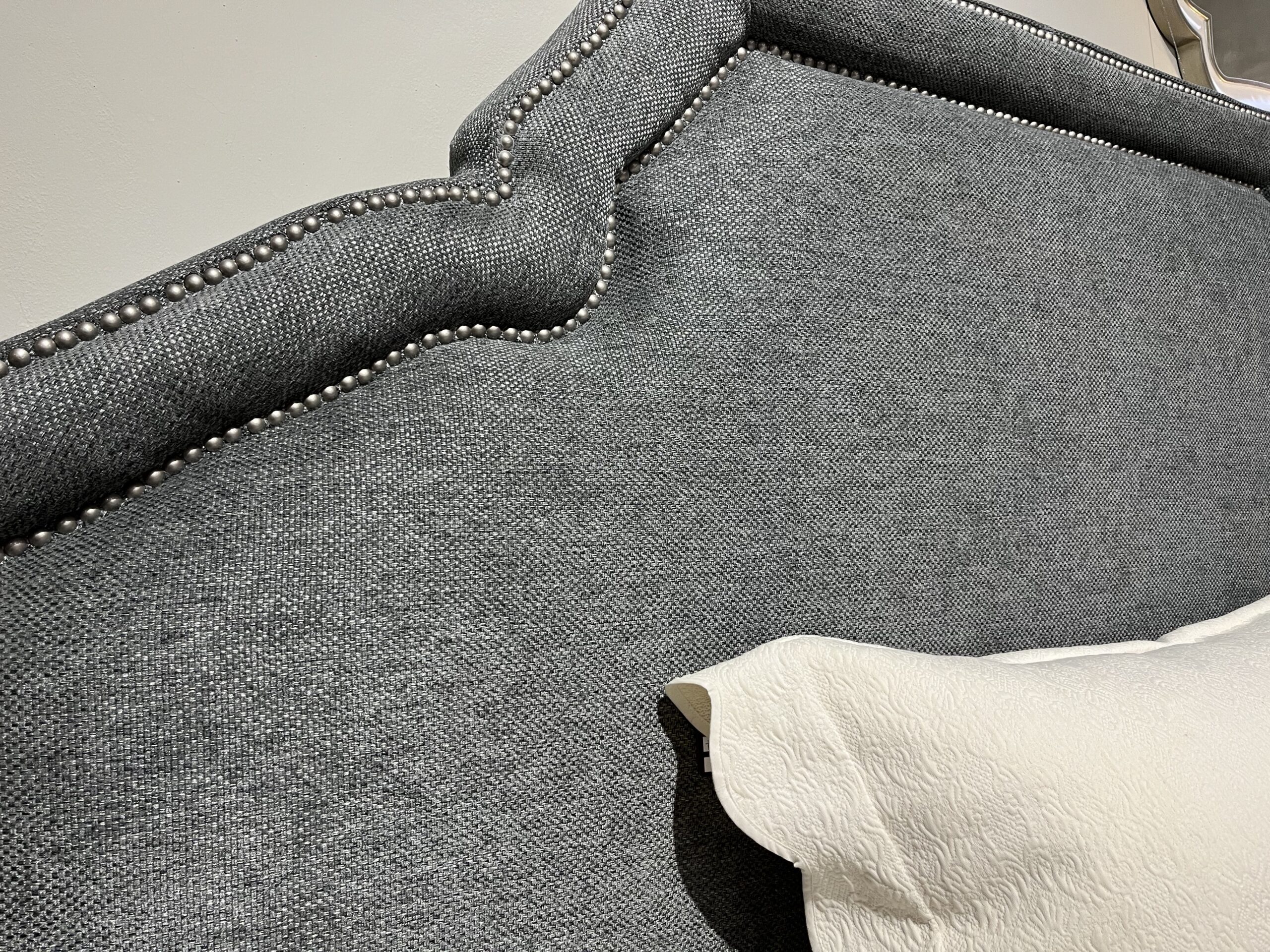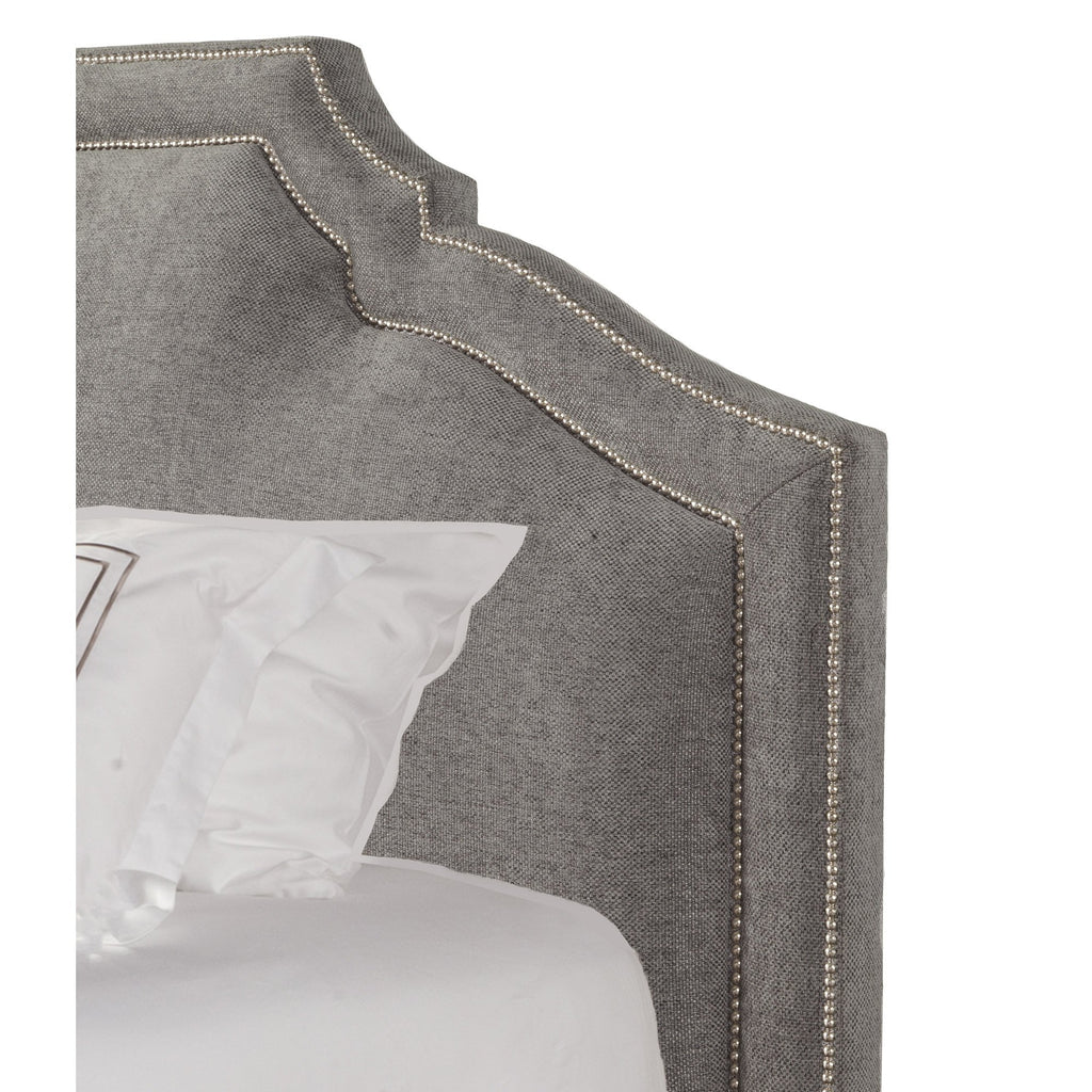 El cabecero está completamente tapizado hasta su base en color gris y se ve bellamente terminado independientemente de la altura del colchón o del somier.Sistema de soporte fuerte con 5 slats y 11 patas, preparada para ajustarse a base automatizada. Tachuelas plateadas alrededor del diseño del espaqldar definen su estilo.