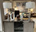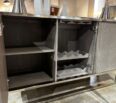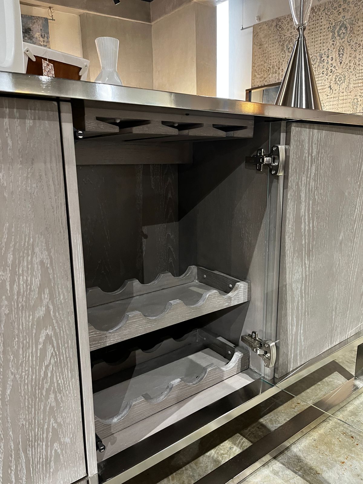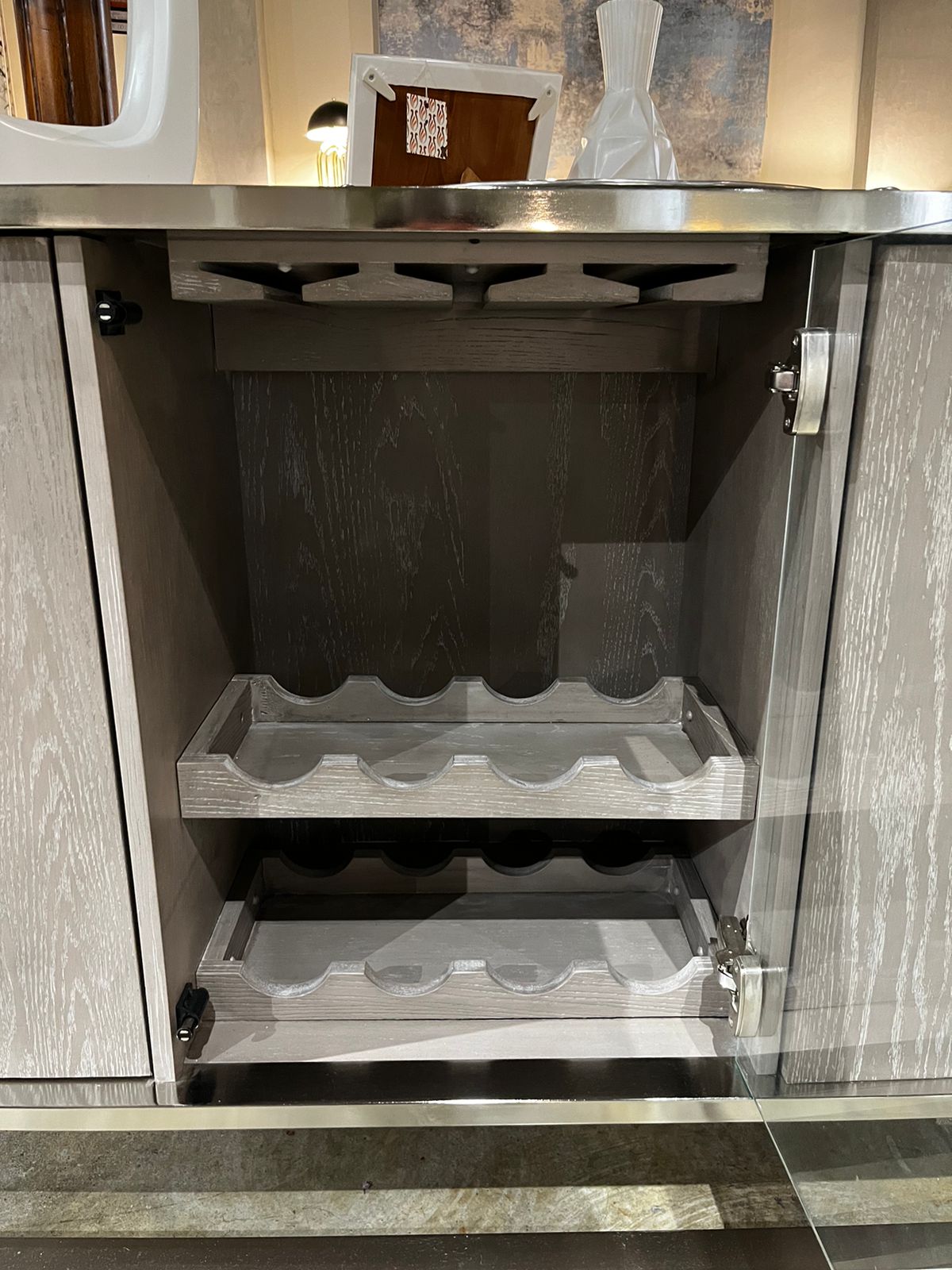 Credenza bar de multiples funciones : almacenamiento y bar. Interior para copas y botellas , puerta central en cristal . puertas a ambos lados en madera con tramos interiores.