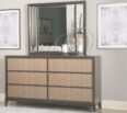 Gavetero y espejo confeccionado en álamo macizo y chapa técnica de tilo, herrajes con acabado de níquel satinado. Construcción de cajones delanteros y traseros de cola de milano inglesa. Guías de cajón metálicas con cojinetes de bolas de extensión completa montadas en los lados del cajón.