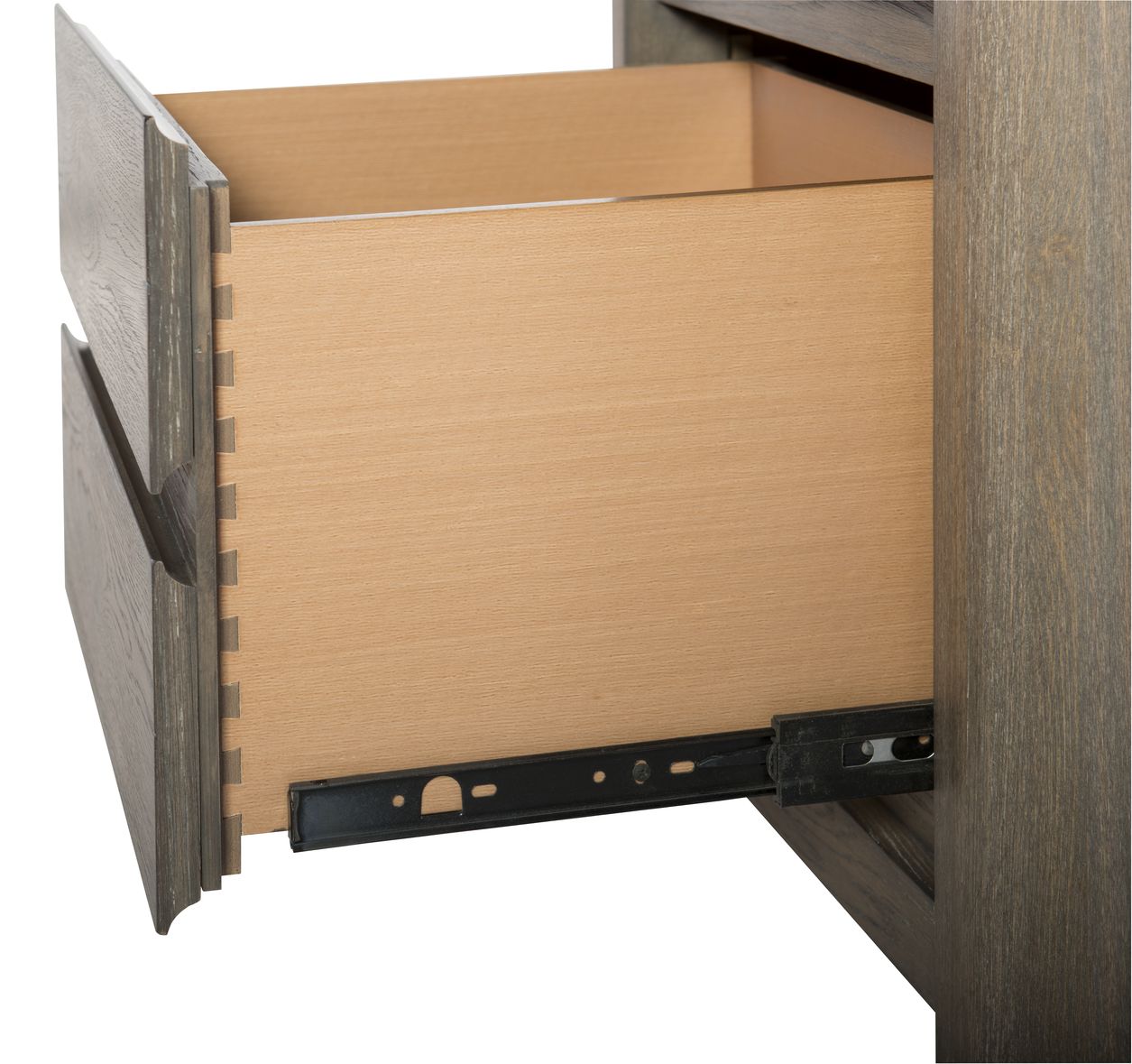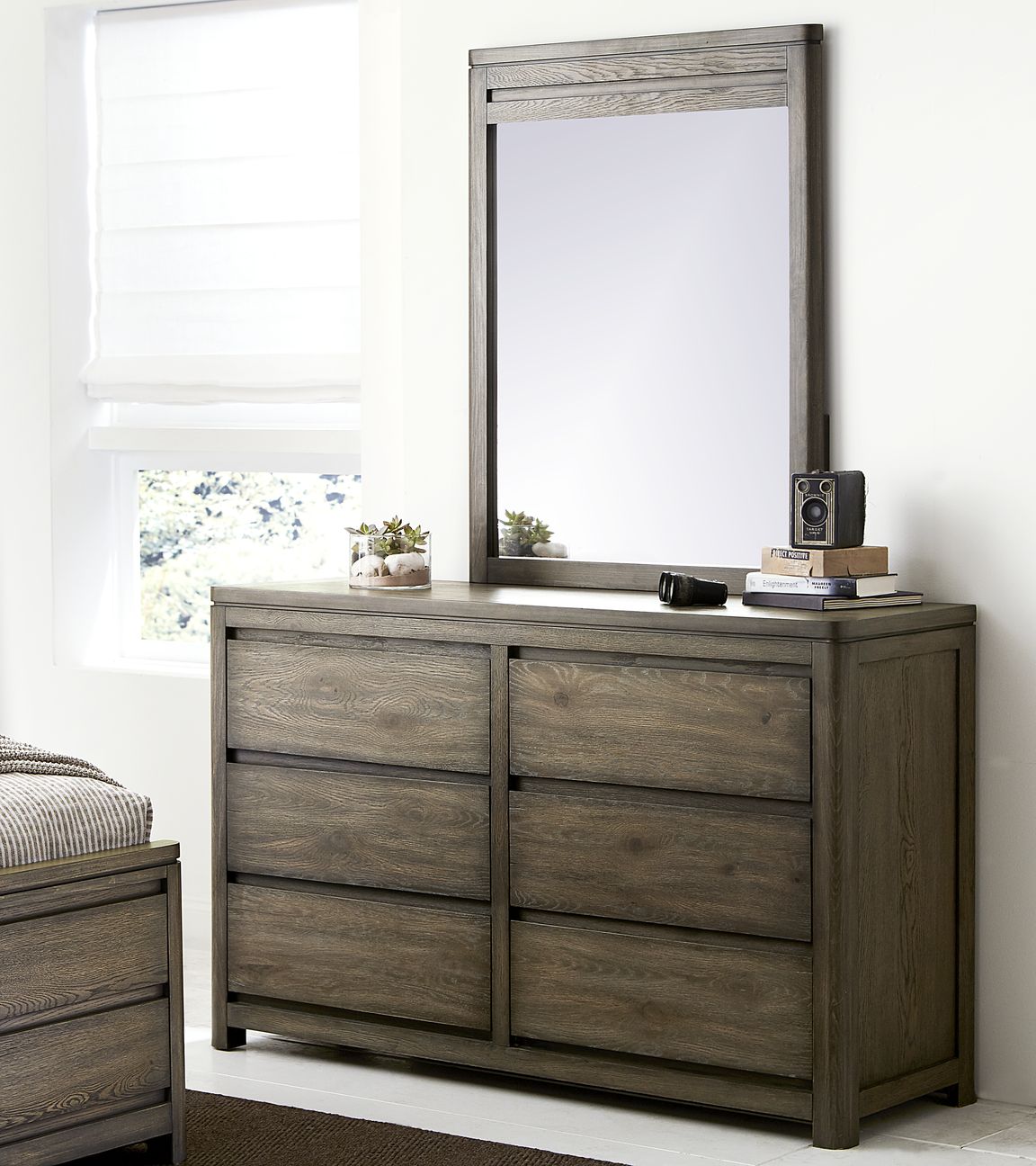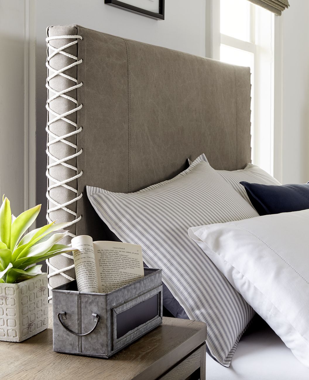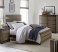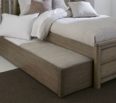 Sólidos de álamo, chapa de roble blanco en acabado roble envejecido. Cabecero tapizado disponible en color gris y washed.