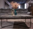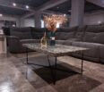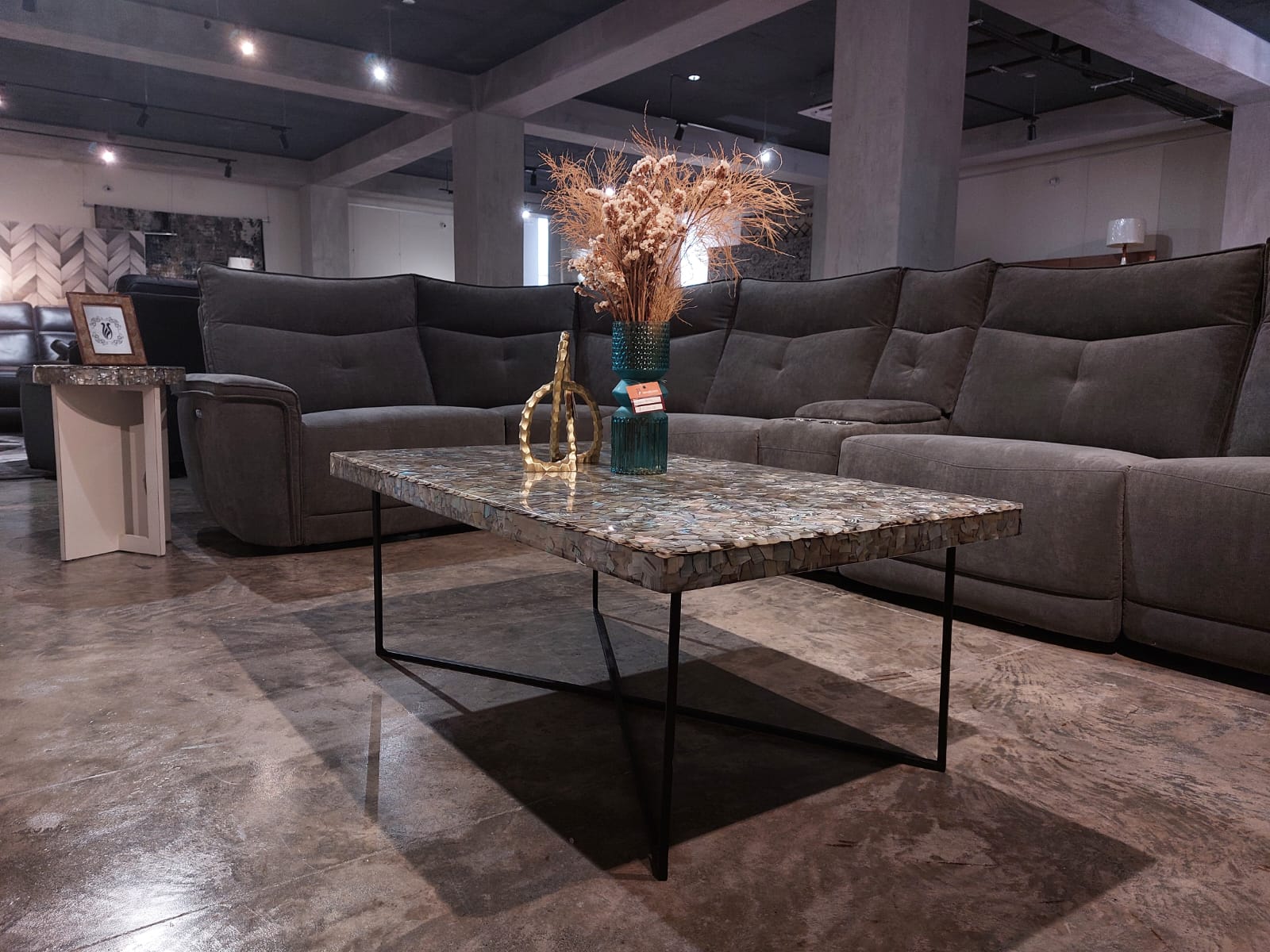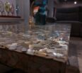 Mesa de centro elaborada por nuestros artesanos dominicanos con base en hierro y tope en almeja y resina de linea limpia y modena.