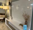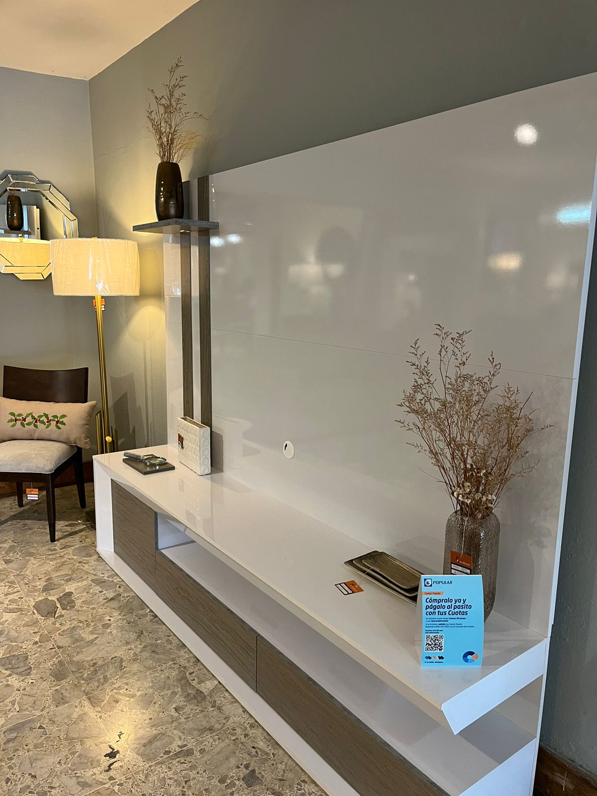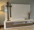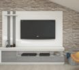 Mueble de pared para Tv en resistente acabado UV laca blanca y melamina color Nautical Grey. Panel incluye luz Led. Dos gavetas y puerta para almacenaje asi como tramo y espacio para elementos decorativos.