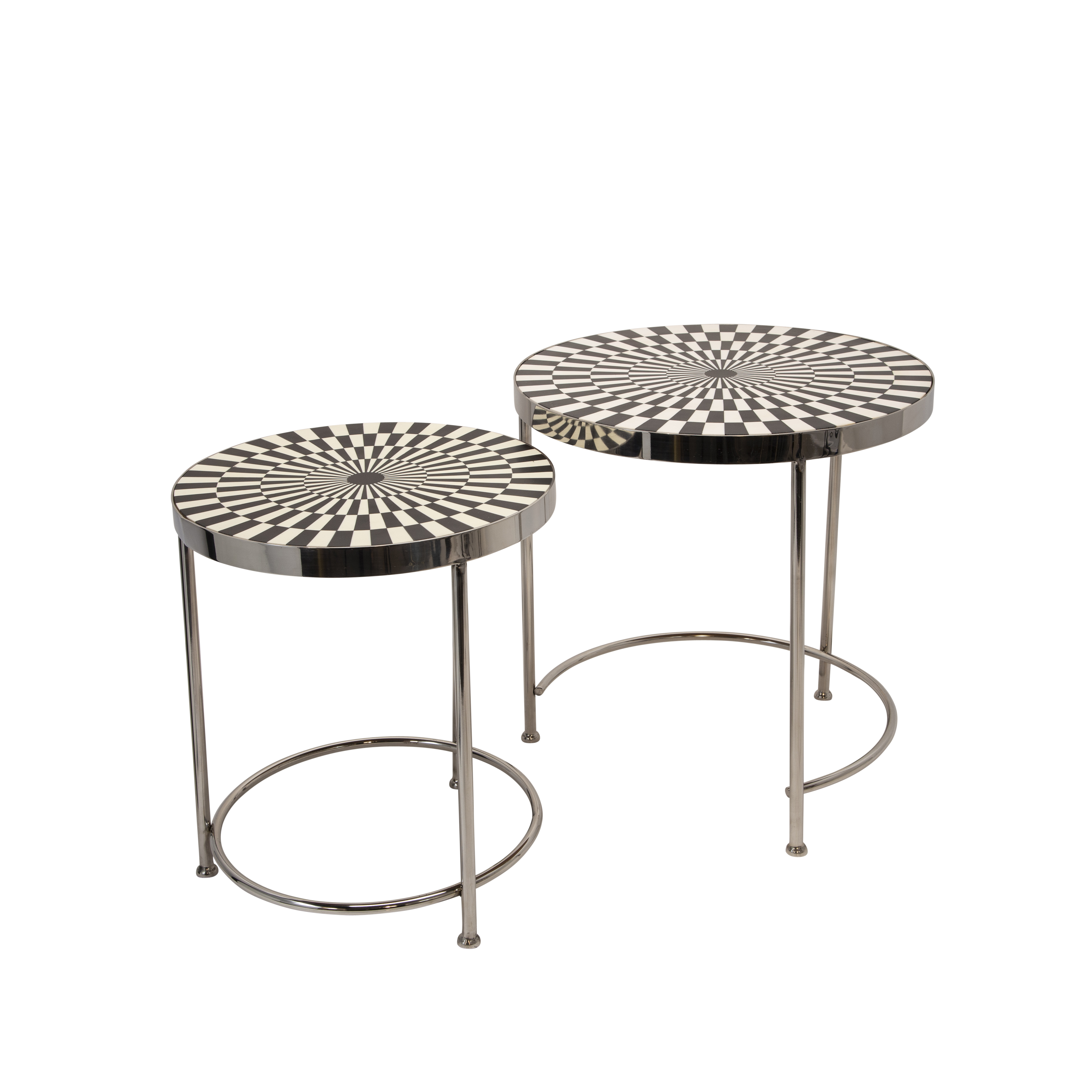 Set de mesas auxiliares en metal con tope blanco y negro diseño geonmetrico.