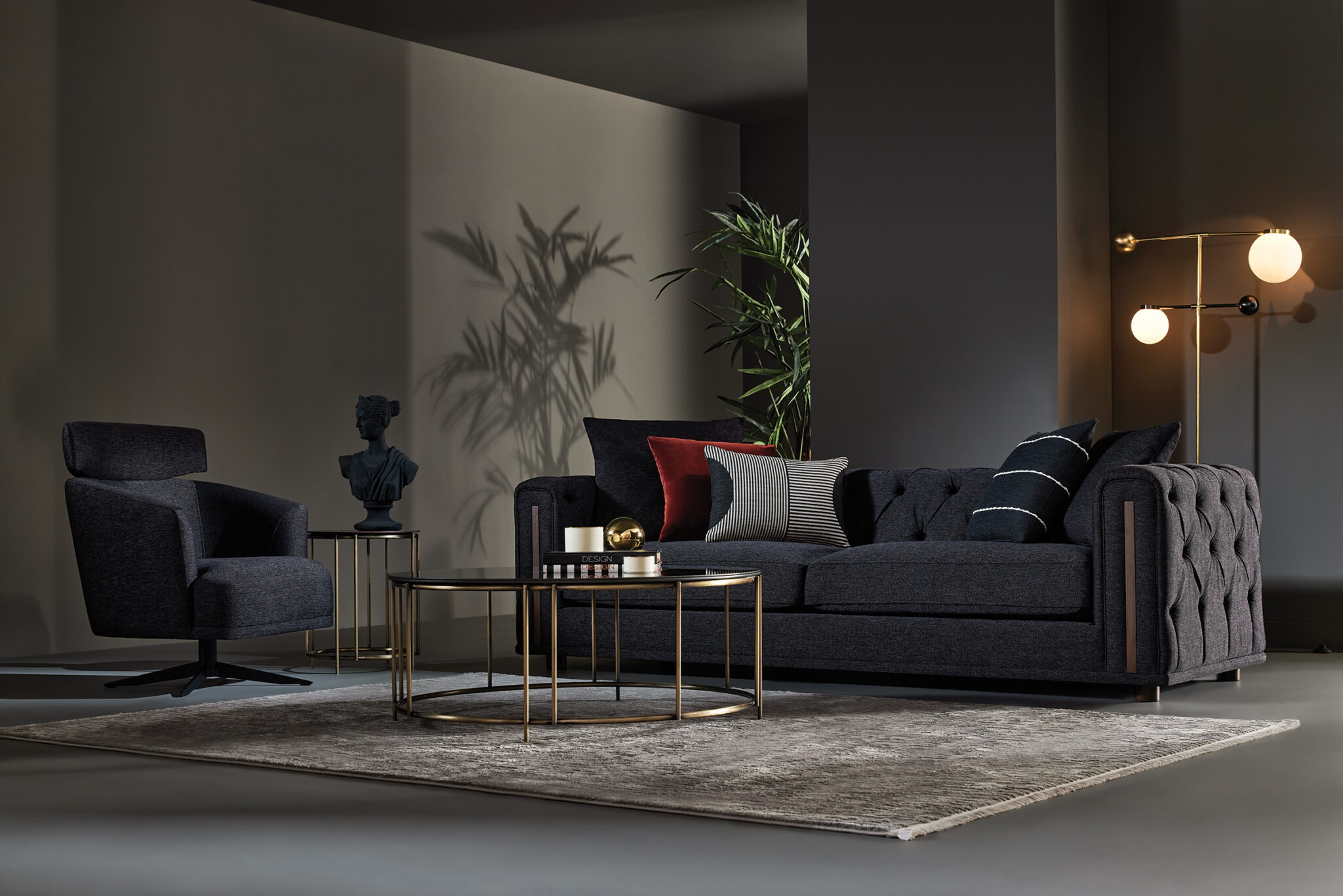 Combina su impresionante visualidad con un confort supremo con la tecnología de espuma multicapa utilizada en el espacio de asientos y su relleno de plumas de ganso. Tapicería impecable en capitoneado y detalles en chapa de nogal en el frente de los brazos, son los detalles añaden elegancia al diseño.